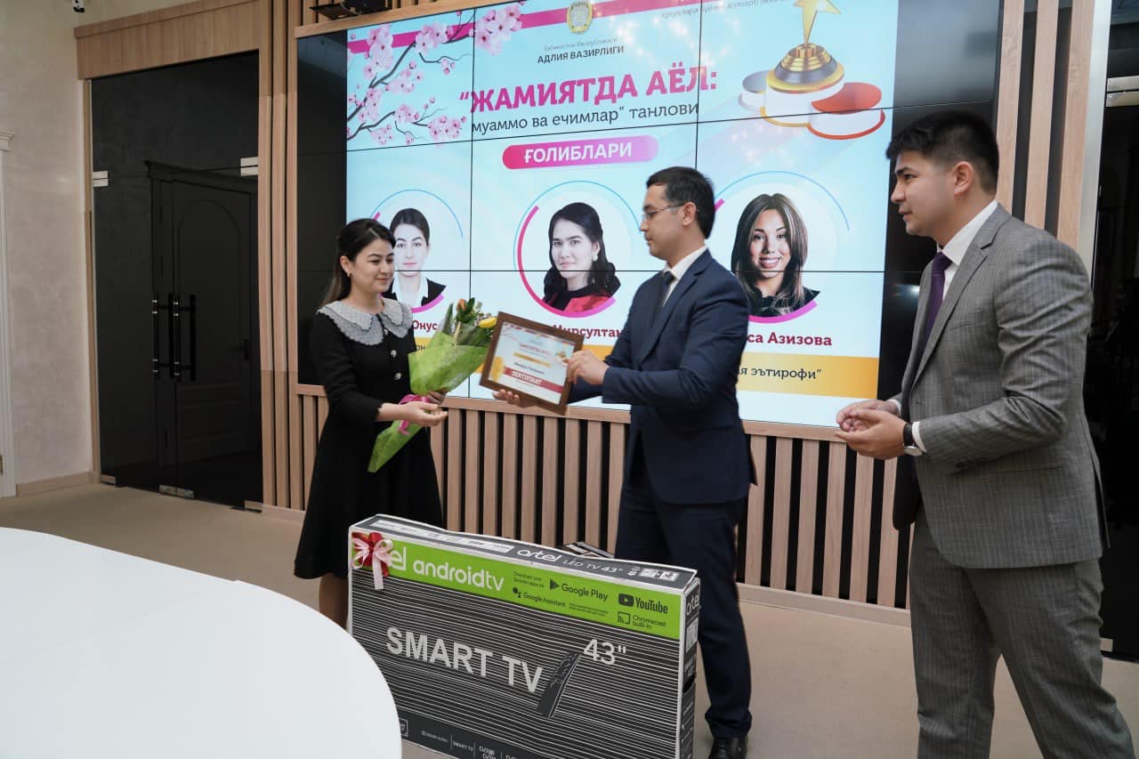 4 aprel kuni Adliya vazirligi tomonidan eʼlon qilingan “Xotin-qizlar huquqlari bo‘yicha dolzarb ikki oy” loyihasi doirasida o‘tkazilgan “Jamiyatda ayol: muammo va yechimlar” tanlovi g‘oliblarini taqdirlash marosimi bo‘lib o‘tdi.