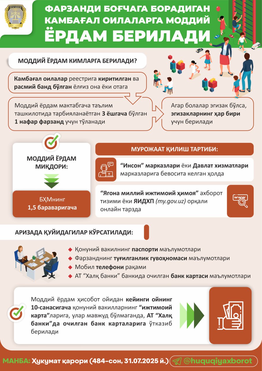 Farzandi bog‘chaga boradigan kambag‘al oilalarga moddiy yordam beriladi
